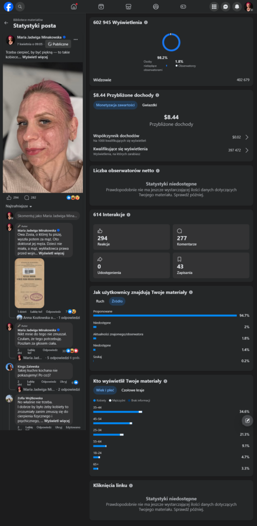 W ciągu 50 godzin post o mezoterapii, oparty na rodzinnej historii z 1908 roku, miał 600 tysięcy wyświetleń, dotarł do około 2% wszystkich kobiet w Polsce (ponad 400 tysięcy osób — w 91% kobiet) — i wygenerował 274 komentarzy, które odsłaniają głębokie napięcia między biologią, doświadczeniem a kulturową interpretacją kobiecego ciała.